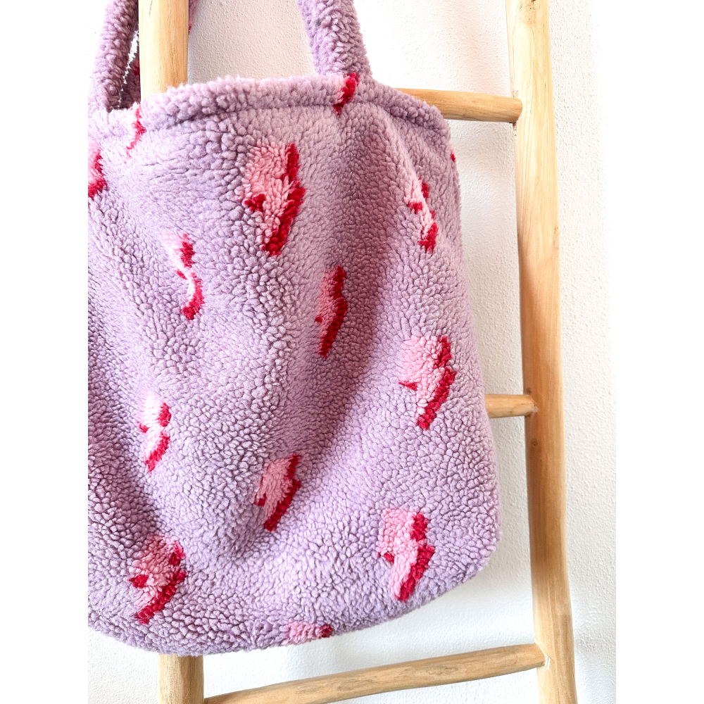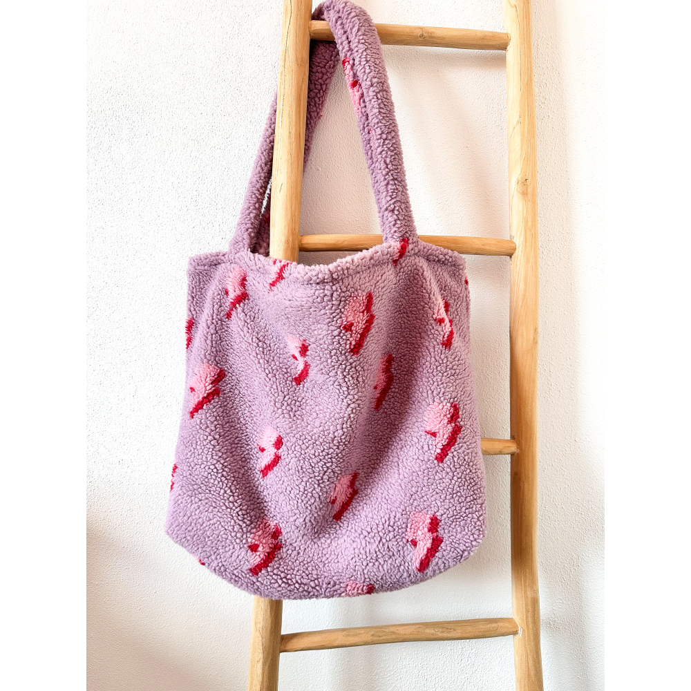 Deze mombag heeft aan de buitenkant een mooie roze teddy stof met een bliksem print en aan de binnenkant een effe beige stof.