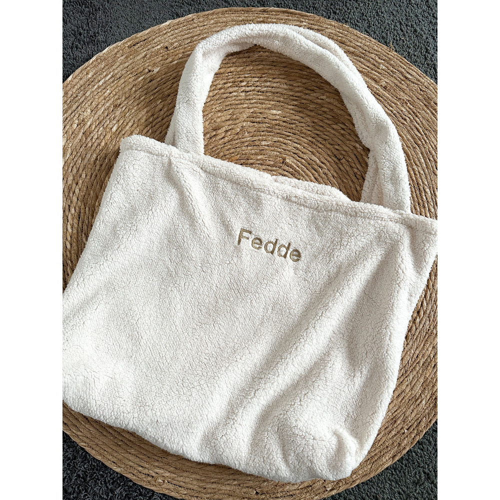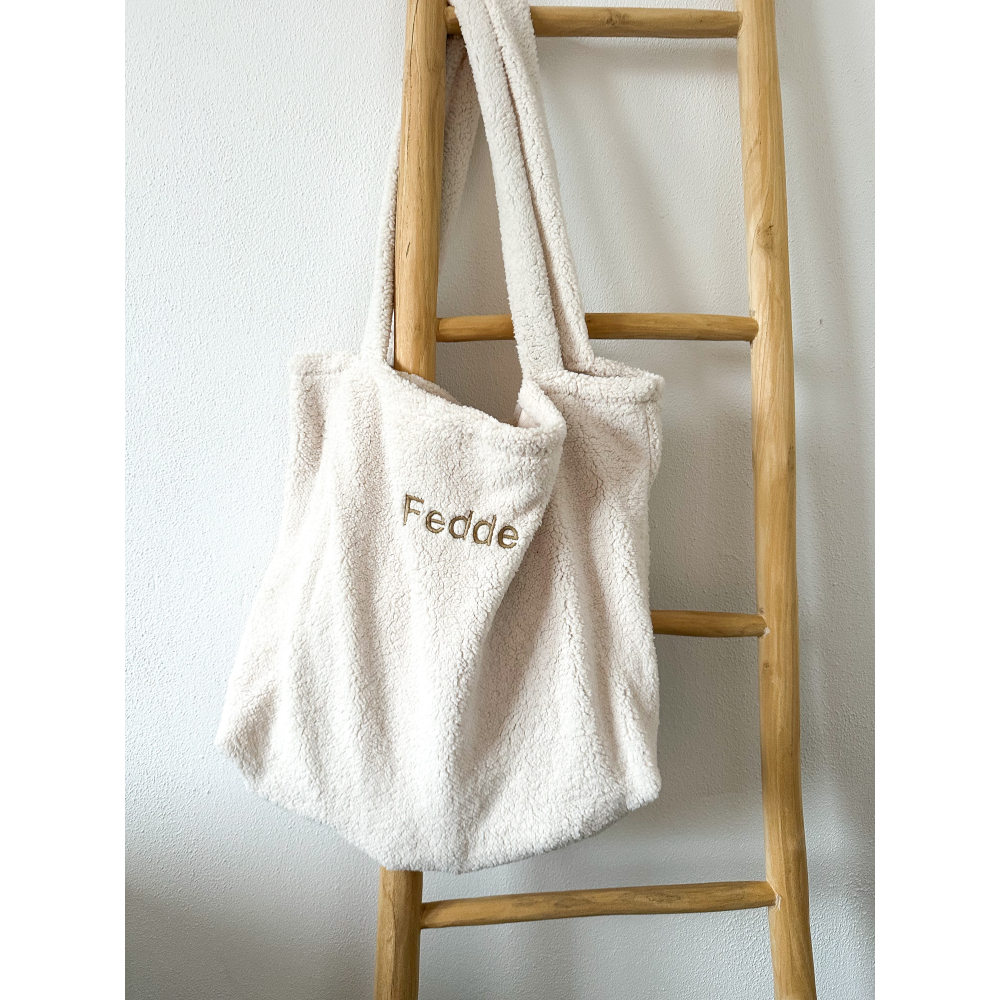 Op de foto's zie je de tas met naam. Als je bij personaliseren niks invult krijg je gewoon de witte teddy tas zonder borduring.
