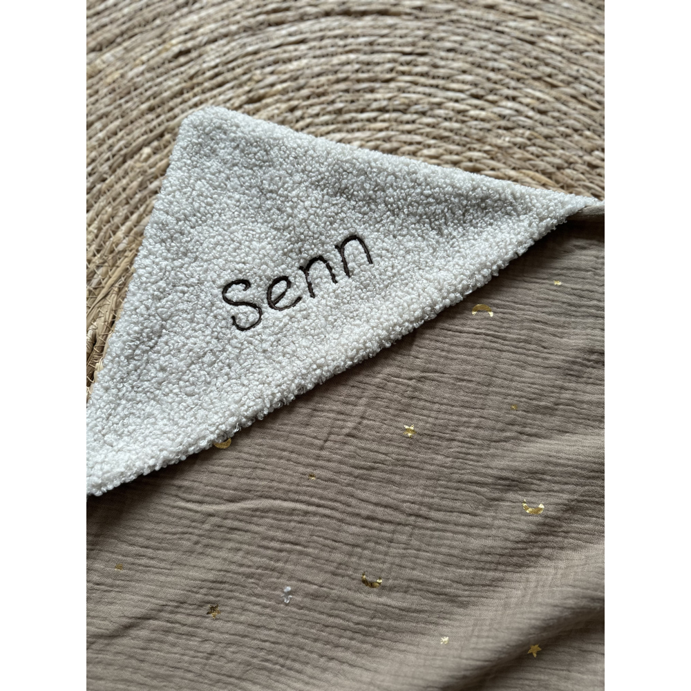 Deze teddy omslag doel heeft aan de binnenkant een hydrofiele stof met een print van maantjes en sterretjes van goud folie.