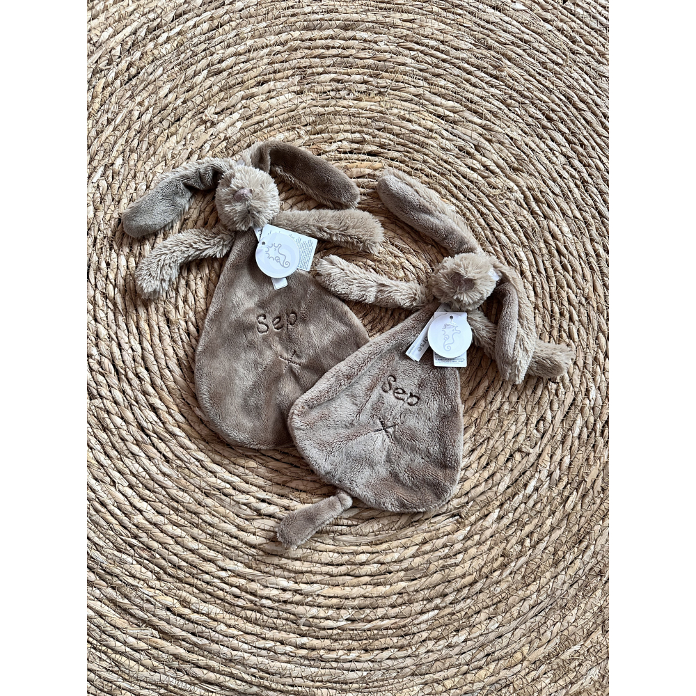 De naam wordt standaard op de buik geborduurd. In het oortje is ook mogelijk alleen dan wordt de naam iets kleiner.